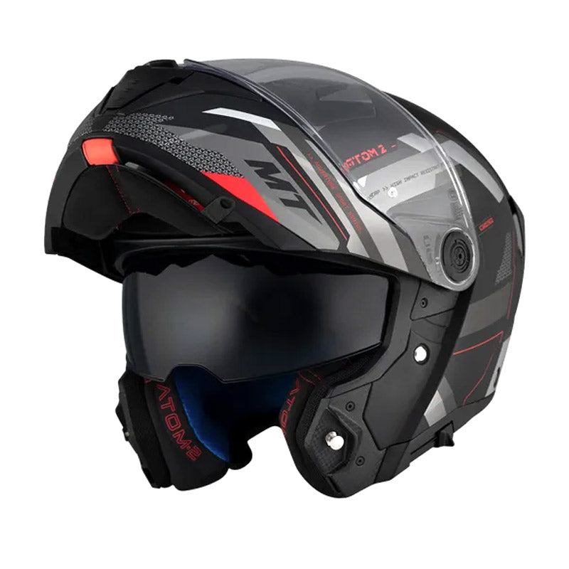 Το MT Atom 2 SV είναι ένα flip-up κράνος με αεροδυναμική σχεδίαση, ιδανικό για περιηγήσεις. Κατασκευασμένο από HIRP, ένα πολύ ανθεκτικό υλικό, διαθέτει μεγάλη αντιχαρακτική ζελατίνα που προσφέρει ευρύ οπτικό πεδίο, συμβατή με Pinlock® (δεν περιλαμβάνεται), εσωτερική φυμέ ζελατίνα που εγγυάται σωστή προστασία από τις ακτίνες UV και σύστημα εξαερισμού με τεχνολογία MT-AFCS που εγγυάται σωστή ροή αέρα.