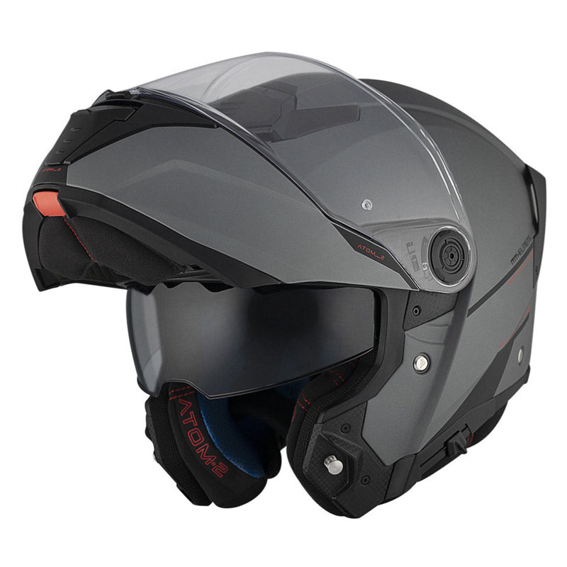 Το MT Atom 2 SV είναι ένα flip-up κράνος με αεροδυναμική σχεδίαση, ιδανικό για περιηγήσεις. Κατασκευασμένο από HIRP, ένα πολύ ανθεκτικό υλικό, διαθέτει μεγάλη αντιχαρακτική ζελατίνα που προσφέρει ευρύ οπτικό πεδίο, συμβατή με Pinlock® (δεν περιλαμβάνεται), εσωτερική φυμέ ζελατίνα που εγγυάται σωστή προστασία από τις ακτίνες UV και σύστημα εξαερισμού με τεχνολογία MT-AFCS που εγγυάται σωστή ροή αέρα.
