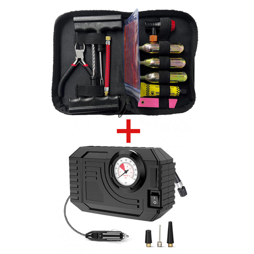 1+1 ΚIT ΕΠΙΣΚΕΥΗΣ ΕΛΑΣΤΙΚΩΝ AGVPRO REPAIR KIT & ΜΙΝΙ ΚΟΜΠΡΕΣΕΡ ΑΕΡΑΤο σετ περιλαμβάνει:1.ΚIT ΕΠΙΣΚΕΥΗΣ ΕΛΑΣΤΙΚΩΝ AGVPRO REPAIR KIT ΣΕΤ 15 ΤΕΜΑΧΙΩΝΒολικό και εύχρηστο τσαντάκι μεγέθους 9 x 11cmΧωράει κάτω από την σέλα και περιέχει όλα τα απαραίτητα για περιπτώσεις εκτάκτης ανάγκηςΠεριέχει: 2 "σουβλιά " 5 ελαστικά κορδόνια 3 φιάλες CO2 ** 1 Ειδικό αντάπτορα για τις αμπούλες CO2. 1 Κοπίδι 1 κόλλα 1 κοφτάκιΥπάρχει η δυνατότητα να αγοράσετε ξανά τα αναλώσιμα περιεχόμενα.Σημείωση : **1 αμπούλα γεμίζει με περίπου 15 psi ένα κοινό λάστιχο κατηγορίας On-off2.MINI ΚΟΜΠΡΕΣΕΡ ΑΕΡΑ 90 PSI 12V OEM-EP170Mini Κομπρεσέρ αέρα 90 psi Pocket με μανόμετρο 12V EP170Mέγεθος: L15cm x W 5cm x H13cm3m καλώδιοAir line length: 60cmΣυνοδεύεται με πληρη σειρά εξαρτημάτων για να φουσκώνετε μπάλες, στρώματα θαλάσσης, λάστιχα κ.λ.π.Ιδανική για να φουσκώνετε λάστιχα αυτοκινήτων, μηχανών, ποδηλάτων ή ακόμα και φορτηγών.