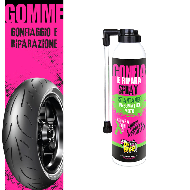 Ειδικό προϊόν ικανό να επιδιορθώνει τρύπες που προκαλούνται από καρφιά ή αιχμηρά αντικείμενα και να φουσκώνει αμέσως το ελαστικό. Χρήση: εξαλείψτε οποιαδήποτε αιτία τρυπήματος, βιδώστε το σωλήνα στη βαλβίδα φουσκώματος (τοποθετημένη προς τα πάνω) και πιέστε προς τα κάτω μέχρι να φουσκώσει πλήρως το ελαστικό.